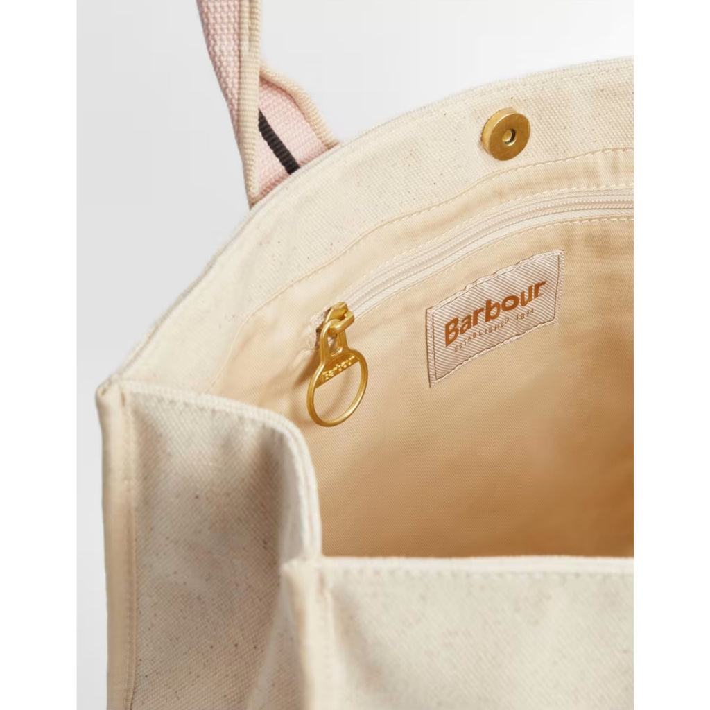 The women's Barbour Madison Square Beach Tote Bag offers a chic, practical way to carry your essentials. With its natural canvas construction and square silhouette, this spacious tote is perfect for a day at the beach or a casual weekend outing. The sturdy webbing handles ensure comfort, while the magnetic stud closure provides quick and easy access to your items. Inside, you'll find zipped compartments to keep valuables secure, making this the ideal companion for both busy city days and laid-back coastal escapes. Its simple yet refined design fits seamlessly into any warm-weather wardrobe.