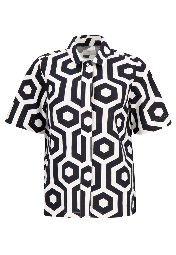 In a clean black & white look and with a geometric print, the blouse by FYNCH-HATTON is a modern fashion highlight. At the same time, classic elements such as a blouse collar, concealed button placket and short sleeves together with the smooth cotton poplin ensure a classy look. Due to the restrained two-tone, the blouse is the perfect piece of clothing for a cool look in the office as well as in the evening at the party or in everyday life.