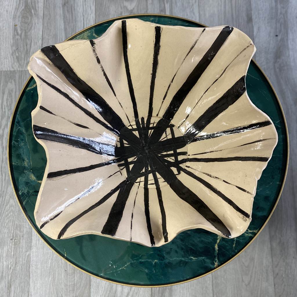 Harlie's signature large statement Wavy Bowl with imperfect wavy edges is hand painted with black brush strokes inspired by our building and a silky clear glaze over the top for that lovely glossy finish.